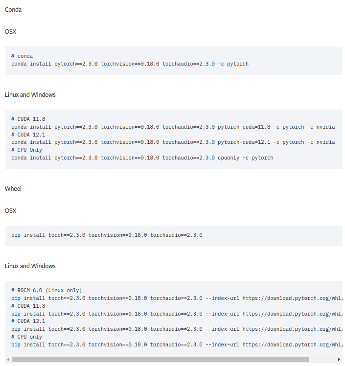PyTorch 2.3.0 버전을 사용하고 싶은 경우, 11.8 GA ~ 12.2 Update 2 내에서 CUDA 11.8 또는 12.1을 사용하면 된다.